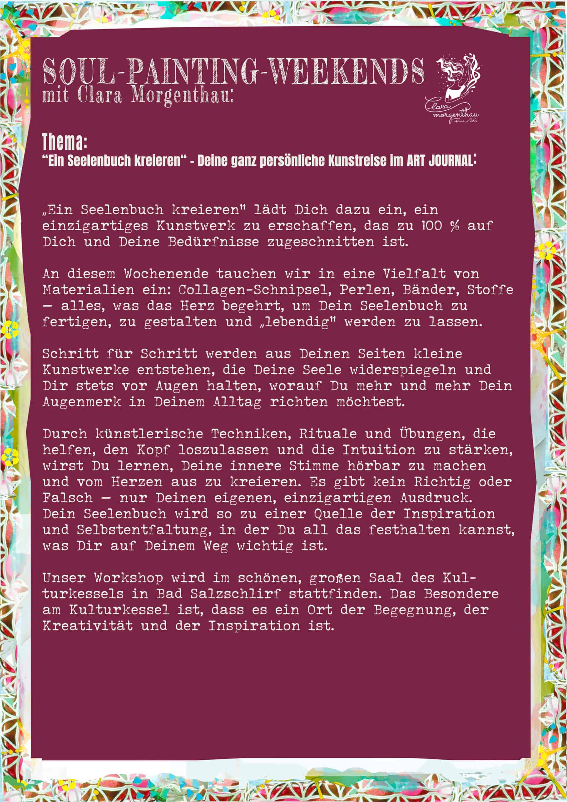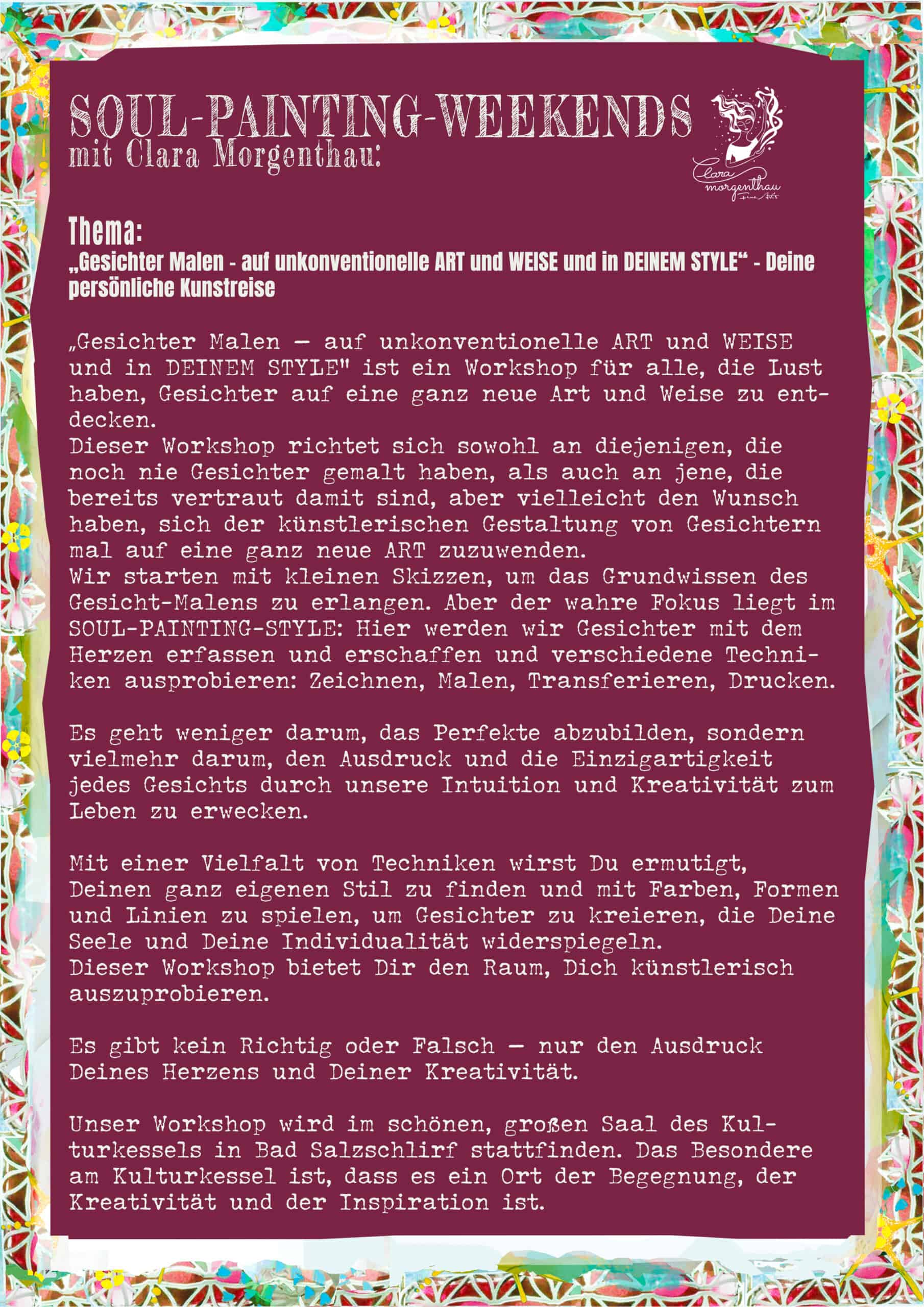 Hier geht es immer um "ganzheitliches" Malen, Soul-Painting. Das bedeutet, dass Herz und Verstand gleichermaßen den kreativen Prozess formen. Ich lade Dich ein, spielerisch und intuitiv zu sein, während wir verschiedene künstlerische Techniken – je nach unserem Wochenend-Thema – erkunden.