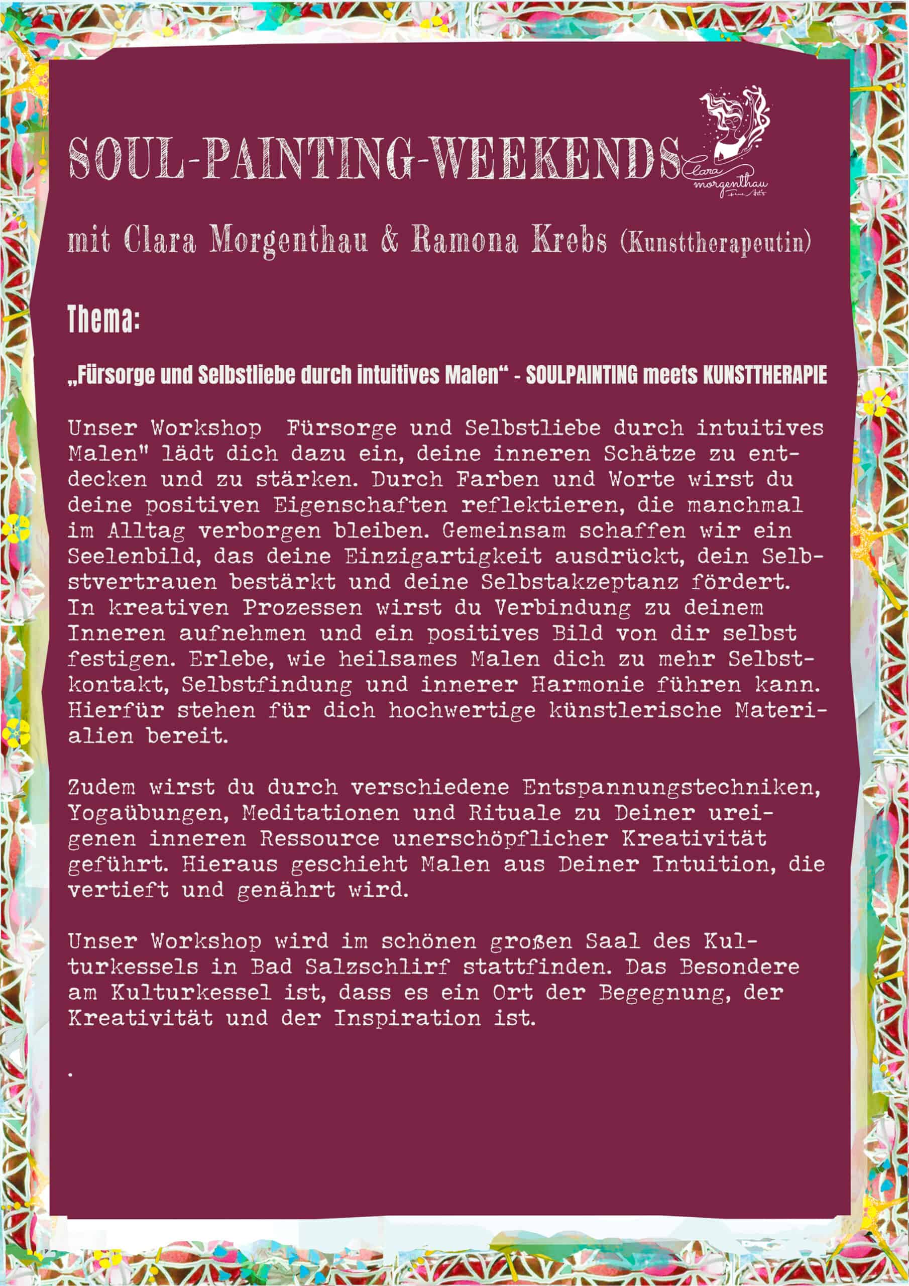 In sorgfältig ausgewählter schönster Umgebung, mit Premium-SNACKS, Yoga & Ent-Spannungs-Techniken erwacht deine natürliche Intuition, wird genährt und verstärkt. Aus ihr kreierst Du wundervolle "Seelenbilder". Dies geschieht, wenn der spielerische Geschmack von Kunst Dein Herz und Deine Seele umspült und sie mit Liebe tränkt. Ich freue mich so sehr auf diese außergewöhnlichen
